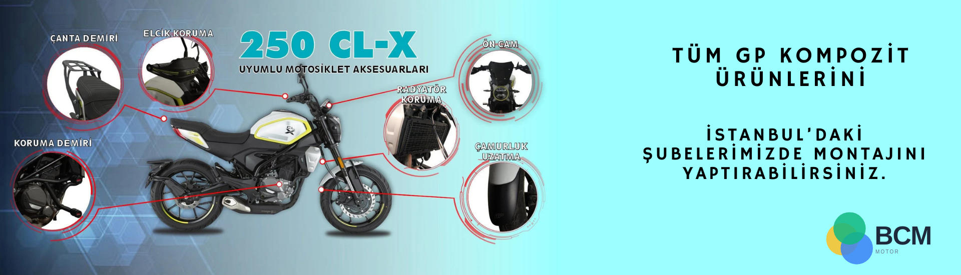 BCM MOTOR olarak Motorunuz için gerekli tüm bakım,onarım ve yedek parçanın yanı sıra, Motorunuzun Makyajı olan tüm koruma ekipmanlarınızı www.bcmmotor.com.tr adresimiz ile size sunmaktayız. Motorunuzun yanında motor sürerken gerekli tüm ekipmanları tarafınıza sunuyoruz. En uygun Fiyat Politikası ile yola çıkan www.bcmmotor.com.tr Alınan motor koruma ekipmanlarının montajınıda İstanbul Avrupa yakasındaki şubelerimizde taktırma fırsatı sunmaktadır.
